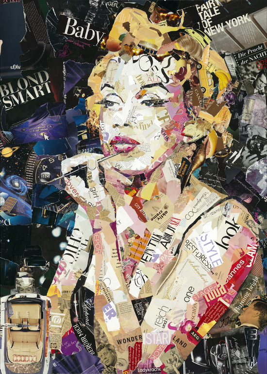 Old newspapers, glossy magazines, posters and paper of any kind are my colors, my source. A new show is created, a new look. I send the viewer on a journey through characters, careers, fortunes, dreams. My work gives me great pleasure – a feeling that I want to get across to the viewer. Each portrait is a journey of discovery. The paper is like a witness. Even the smallest scrap of paper tells a story and like through a puzzle I create a new appearance of the person.